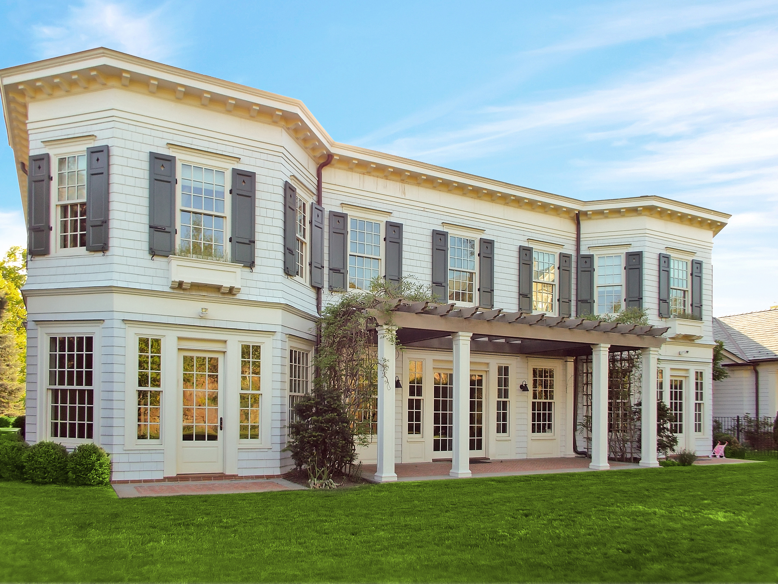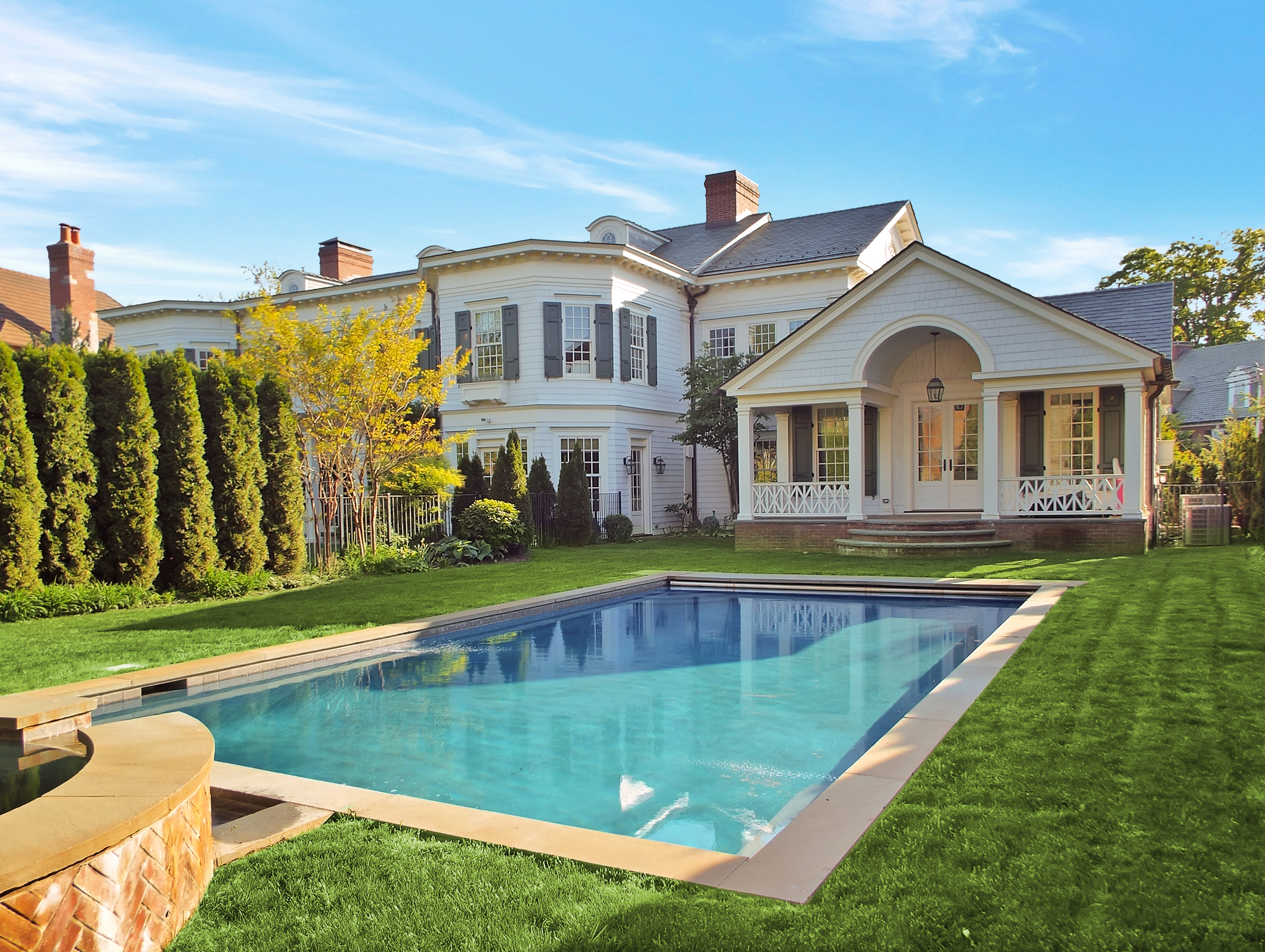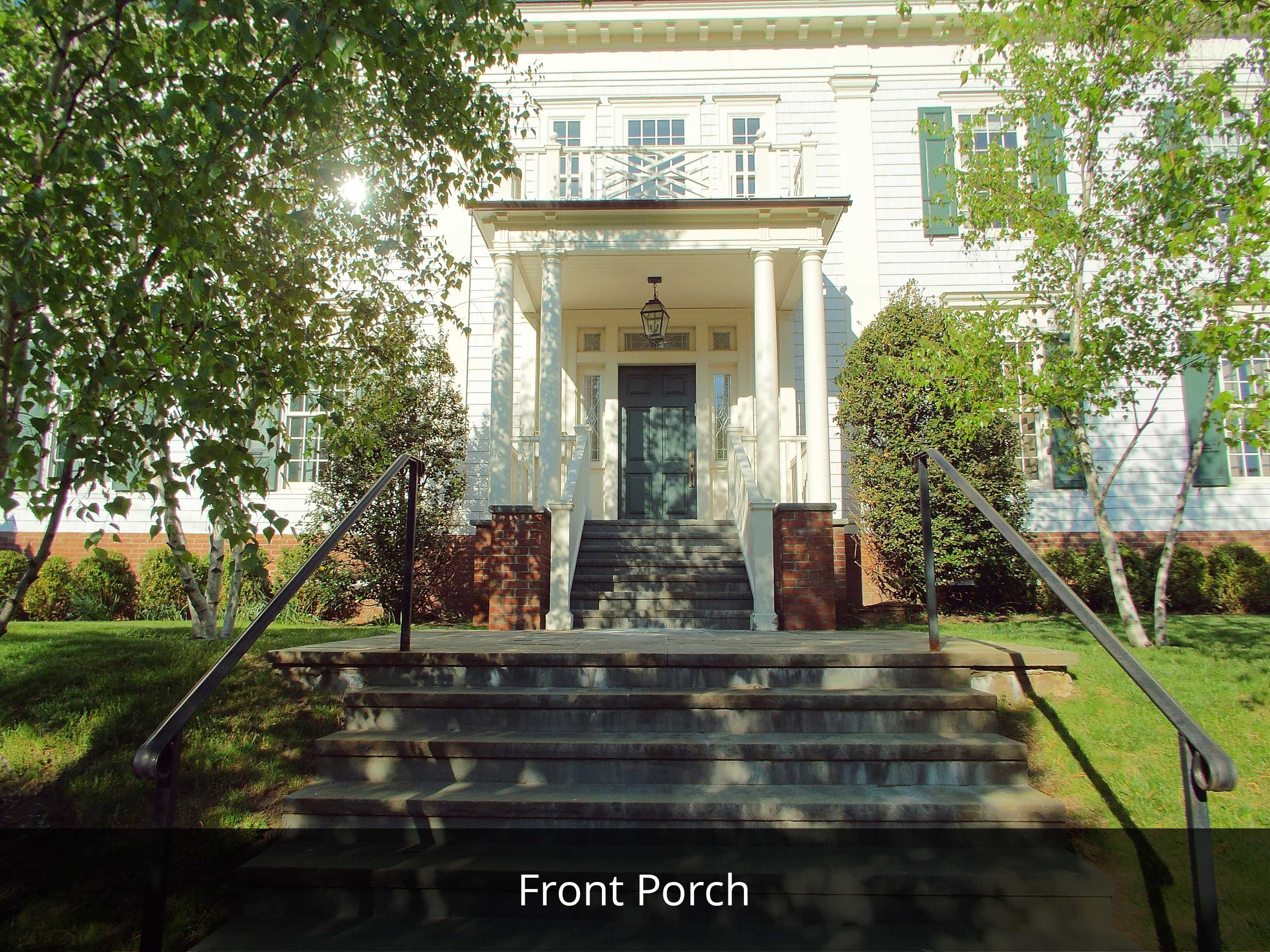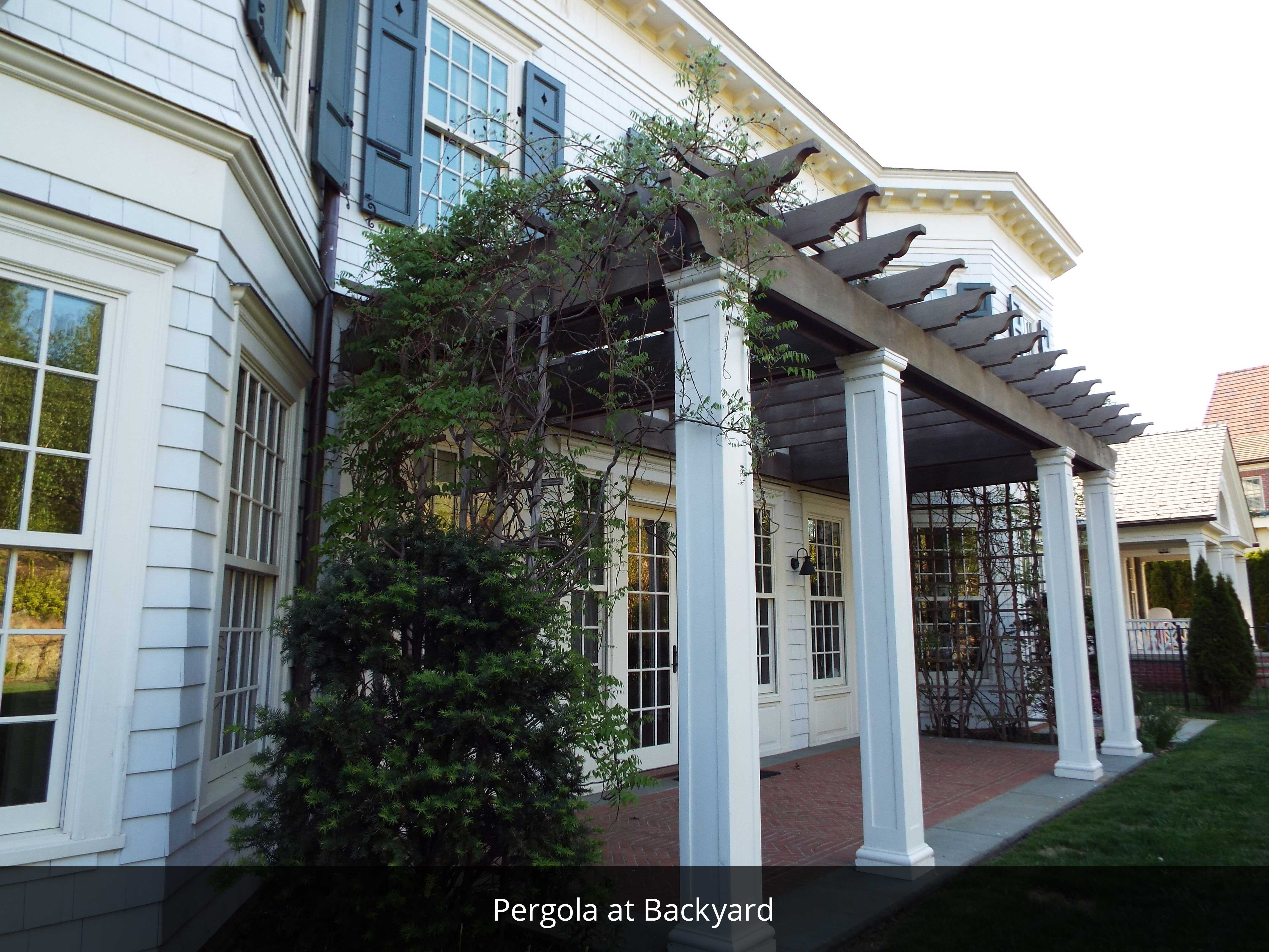 - Brick paved pergola and porches, Old Virginia Brick, with blue Stone edging